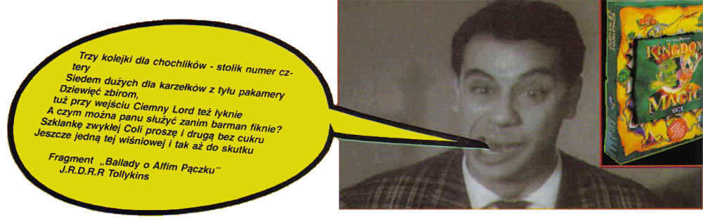 Ja jednak jestem wciąż zdumiony, gdyż nieustanne rubaszne, niewybredne. iście marynarskie dowcipy seksualne, duża doza obciętych głów, kikutów („dam ci rękę mojej córki, tylko nie wiem gdzie ją położyłem”) i rozczłonkowanych ciał oraz zdarzające się, niezwykle zabawne, ale jednak, wulgaryzmy niekiedy wręcz szokują. Bardzo jestem ciekawy, co by się zaczęto dziać. gdyby gra została całkowicie spolszczona. Grafikę w „Kingdom O’Magic” zrealizowano na komputerach Silicon Graphics. Postacie łażące nieustannie po sympatycznie wyglądających planach zmieniają swój rozmiar w zależności od miejsca na ekranie. Choć jest to. niestety, niska rozdzielczość i kształty postaci czasami są lekko poszarpane, całość wykonano jednak bardzo starannie. Akcję gry przerywają często ładne renderowane animacje, czasami zaś zabawne czarnobiale filmy z okresu, jak się wydaje, mniej więcej lat czterdziestych.